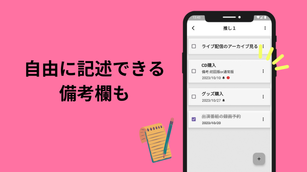 推し活以外にも普段のスケジュール管理や勉強管理、買い物リストとしての使用など幅広い用途に使えるアプリです。
