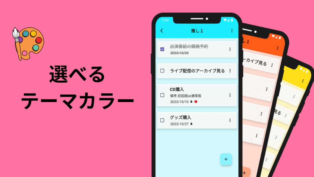 10種類以上からテーマカラーを選ぶことができるので、好きな色や推しのメンバーカラーを設定して自分好みのTODOリストを作れます。