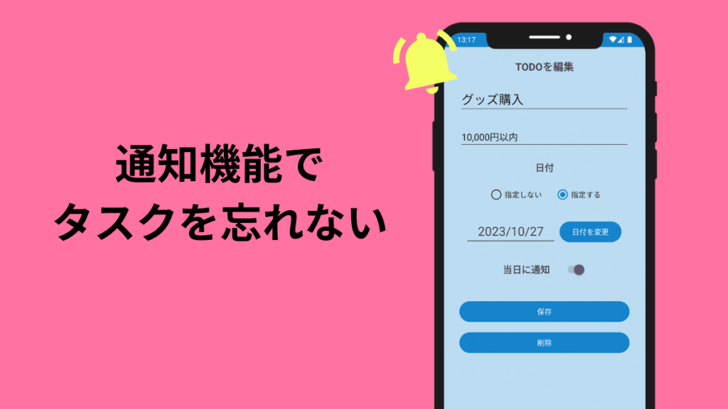 TODOごとに通知を設定することができます。設定した通知はスケジュール当日の午前7時に届きます。