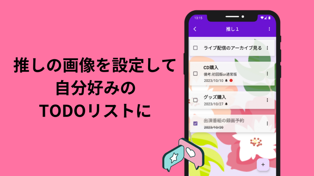 TODOリストにアイコン画像を設定していた場合には通知にもアイコン画像が表示されるので、推しから通知が届いたような気持ちになれてTODOのモチベーションも高まります。