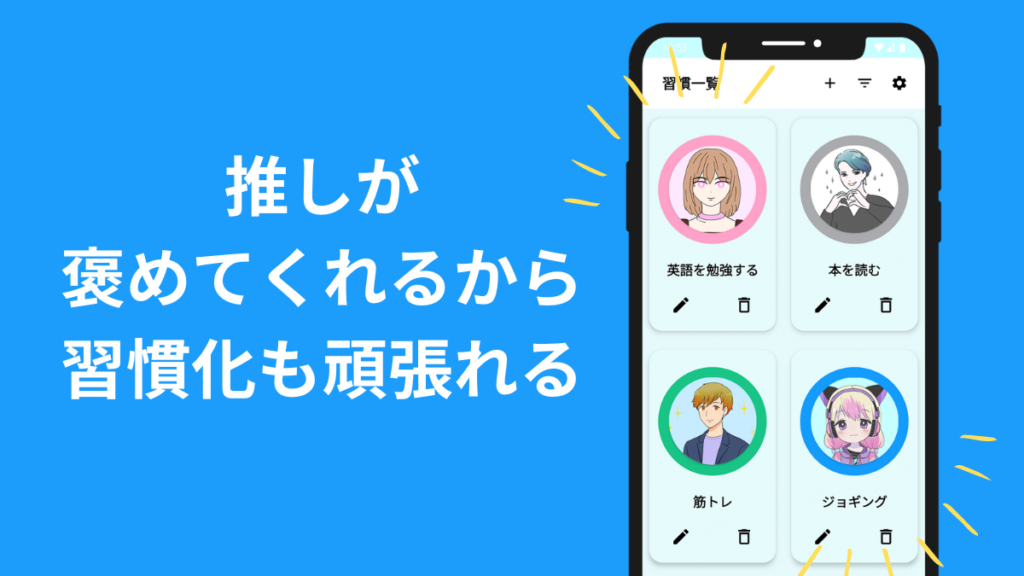 「習慣化したいけどやる気が出ない」「モチベーションが維持できない」「推しが応援してくれたら頑張れるかも」という方に特におすすめの習慣管理アプリです。