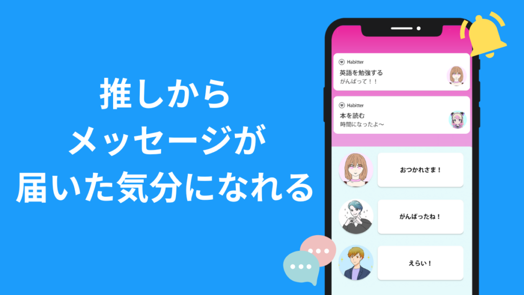 「お疲れ様」「頑張ってね」など推しに言ってほしいセリフを設定すれば、習慣を継続するモチベーションを上げることにも繋がるでしょう。