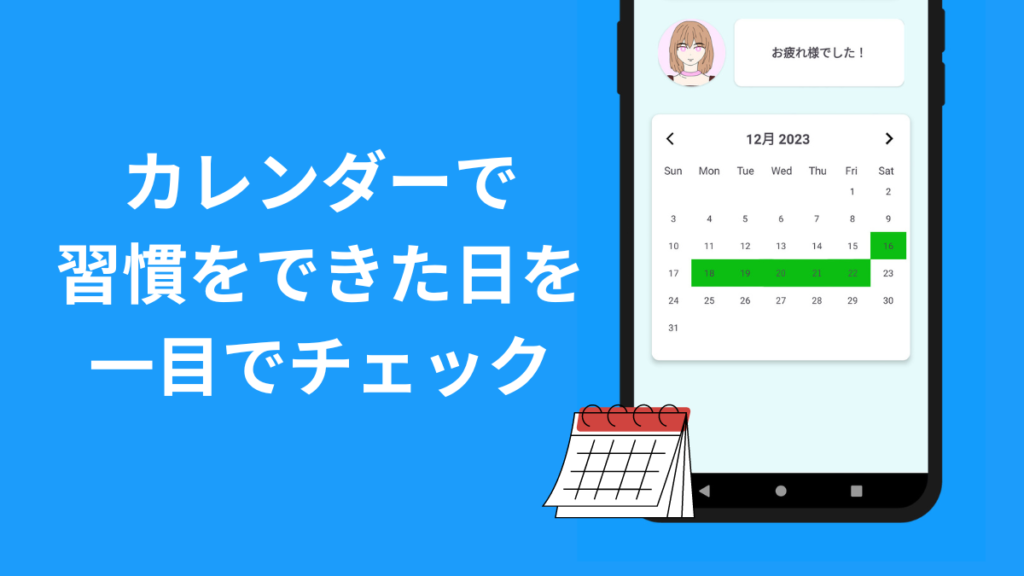 習慣ごとに、その習慣の継続状況を確認できるカレンダー機能を搭載しています。